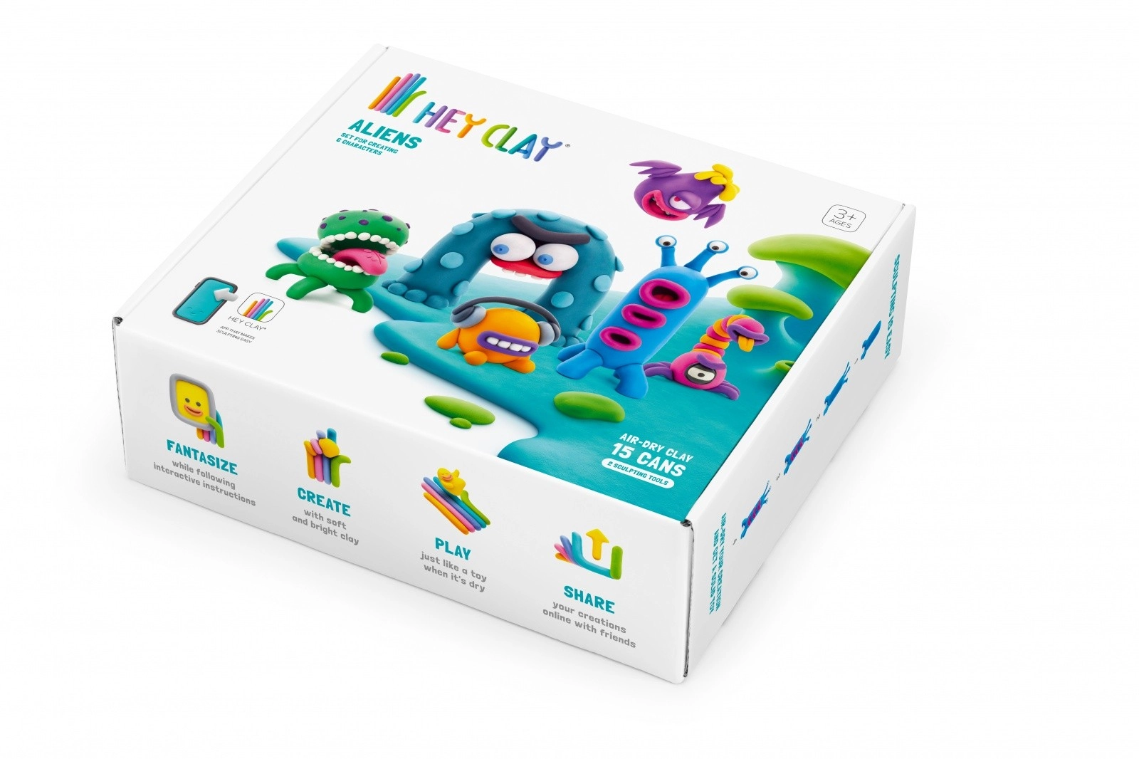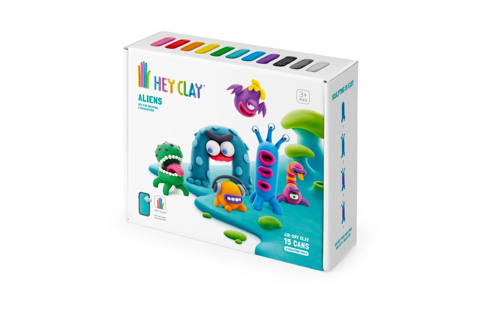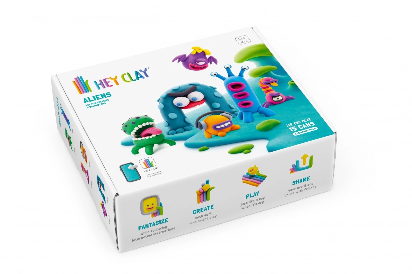 Sada Hey Clay Aliens přináší dětem hravou cestu do světa tvoření. Lehounká, samoschnoucí „pěnová“ modelína se nelepí a nešpiní, skvěle drží tvar a po vyschnutí si postavičky můžete vystavit nebo si s nimi dál hrát. Díky 15 zářivým barvám a jednoduchým krokovým návodům v aplikaci si děti vytvoří až šest roztomilých mimozemšťanů a ještě jim zbude materiál pro vlastní nápady.