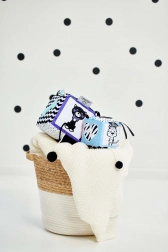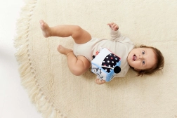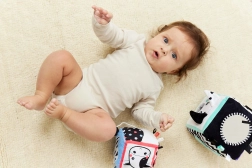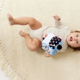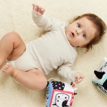 Vysoký kontrast černobílých motivů s barevnými detaily stimuluje zrak a udrží pozornost miminka během hry.