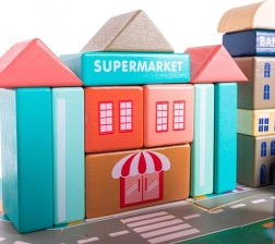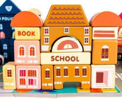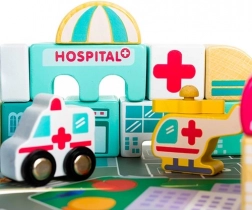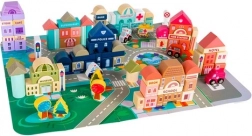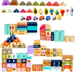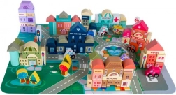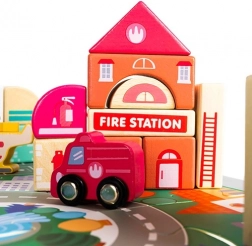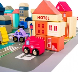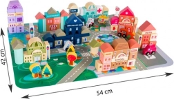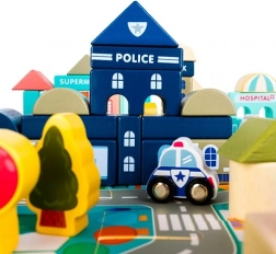 Bohatá výbava zahrnuje budovy jako škola, nemocnice, hasičská stanice, policie, banka, knihkupectví, supermarket, muzeum či kavárna, a také 7 vozidel (policie, hasiči, sanitka, taxi, školní autobus, auto, vrtulník). Dřevěné prvky jsou pečlivě broušené, hrany zaoblené a barvy netoxické – ideální pro bezpečnou dětskou hru.
