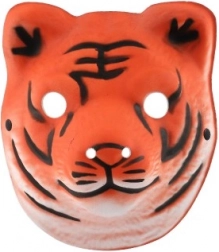 Tygří maska v oranžové barvě s výraznými černými pruhy, ideální pro všechny malé milovníky zvířat.