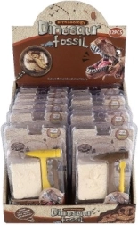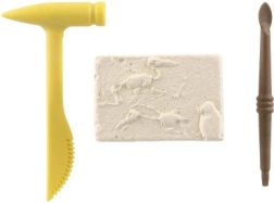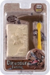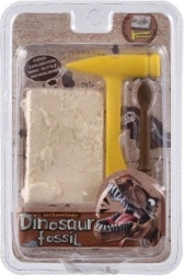 V balení najdete blok s otiskem dinosauří kostry a potřebné nástroje pro vykopávání - plastové kladívko a dláto.