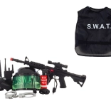 Vybavte malého hrdinu kompletní policejní výbavou: tato sada SWAT obsahuje helmu s hledím, taktickou vestu, samopal, pistoli, vysílačku, pouta, obušek, sluchátka a granát. Ideální pro hraní rolí, maškarní i domácí dobrodružství. Lehký plastový materiál je bezpečný pro děti od 3 let.