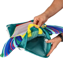 Stylový vak s mořským motivem vám pomůže pohodlně přenášet plavecké vybavení – od ocasu/monoploutve po plavky a ručník. Prodyšné části umožňují rychlé vysychání po použití, takže obsah nezůstává dlouho vlhký.