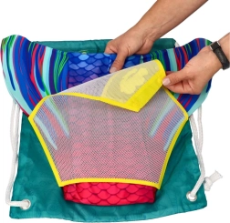 Síťované části a vzdušný materiál pomáhají obsahu rychleji vysychat po plavání, takže je vak připravený k dalšímu použití.