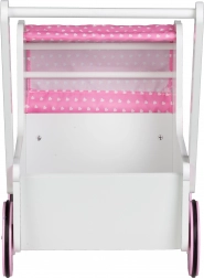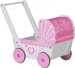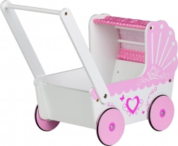 Dřevěný kočárek pro panenky ECOTOYS kombinuje bezpečí, stabilitu a kouzelný design. Jemné růžové srdíčka, oblouková stříška a ladné křivky dodají dětskému pokoji půvab a zároveň podpoří fantazii a sociální dovednosti při hře na pečování.