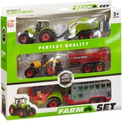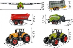 - Kompletní farma v krabici: 2 traktory + přívěs na zvířata + vyklápěcí vůz + postřikovač + lis