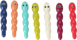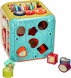 Sorter tvarů, točítka a posuvné prvky trénují úchop, koordinaci a řešení úkolů. Barevné kostky a čísla podporují rozpoznávání barev, tvarů a počítání.