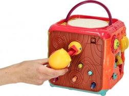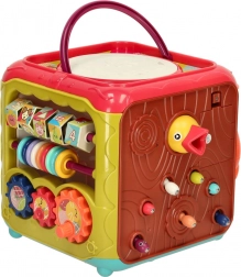 Součástí je i oblíbená hra „nakrm ptáčka“ s magnetickými broučky a houpající se sovičkou, stejně jako barevné kostky do sorteru tvarů. Díky praktickému madlu je kostka snadno přenositelná a ideální pro domácí i cestovní hraní.