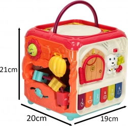 Vzdělávací kostka 6v1 je zábavné centrum pro nejmenší průzkumníky. Každá stěna skrývá jinou činnost, která stimuluje smysly a rozvíjí dovednosti dětí od 18 měsíců. Od realistických zvířecích zvuků na piánku, přes otvírací dvířka a pohyblivé prvky až po třídění tvarů a točící ozubená kolečka – dítě si procvičí ručky i hlavičku.