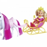 Evi vyjíždí v romantických saních tažených bílým koníkem s růžovou hřívou – perfektní set pro zimní i pohádkové scény.