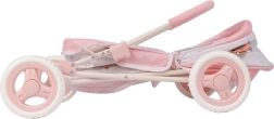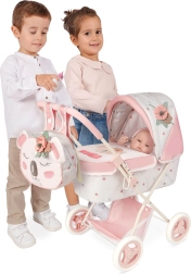Kočárek je skládací, takže jej snadno uložíte nebo vezmete na cesty. Praktická spodní přihrádka, měkoučká matrace a kryt korbičky s poutky zajistí pohodlí pro panenku i pořádek při hře. Součástí je také stylový batůžek, který lze připnout na rukojeť nebo nosit na zádech.