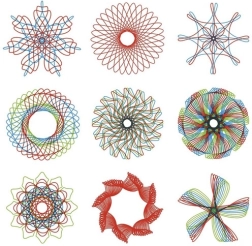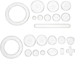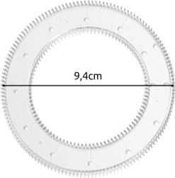Průhledná ozubená kolečka a prstenec vedou pero s jistotou – snadno vytvoříte pravidelné hypotrochoidy, epitrochoidy a mandalové ornamenty.