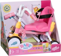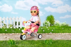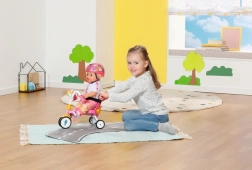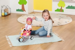 Tato růžová tříkolka je navržena pro realistickou hru s panenkami BABY BORN. Dítě může panenku tlačit pomocí 45 cm dlouhé vodící tyče nebo ji nechat „šlapat“ díky poutkům na pedálech. Pevná konstrukce a stabilní tříkolový podvozek podporují jistou jízdu doma i venku.