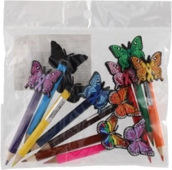 Tato sada obsahuje 10 různobarevných pastelek, z nichž každá má na vrcholu ozdobu v podobě motýlka. Ozdoby přidávají pastelkám hravý a dekorativní prvek, díky čemuž jsou ideální pro děti nebo kreativní psaní. Pestrobarevné motýlky přinášejí do vašeho psaní a kreslení špetku fantazie.