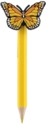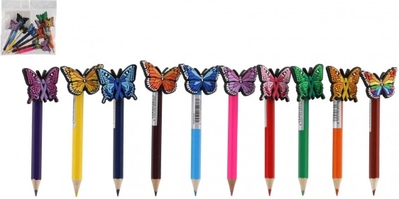 Každá pastelka je ozdobena barevným motýlkem, který dodává pastelkám veselý a funkční vzhled.