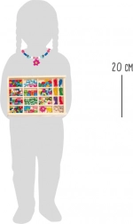 Kreativní sada pro malé designéry šperků: v dřevěném boxu s průhledným posuvným víkem najdete celkem 157 dřevěných korálků, 6 navlékacích stuh a 3 přívěsky. Díky 19 přihrádkám je vše přehledně roztříděno, což podporuje jemnou motoriku, trpělivost a kreativitu dětí – ideální i na cesty.