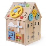 Interaktivní dřevěný domeček s množstvím prvků pro smyslové zkoumání a učení rozvíjí jemnou motoriku, koordinaci ruka-oko a samostatnost. Děti si zábavnou formou procvičí zapínání, zavazování, přepínání, otáčení a odemykání, zároveň se seznámí s počítadlem a hodinami.