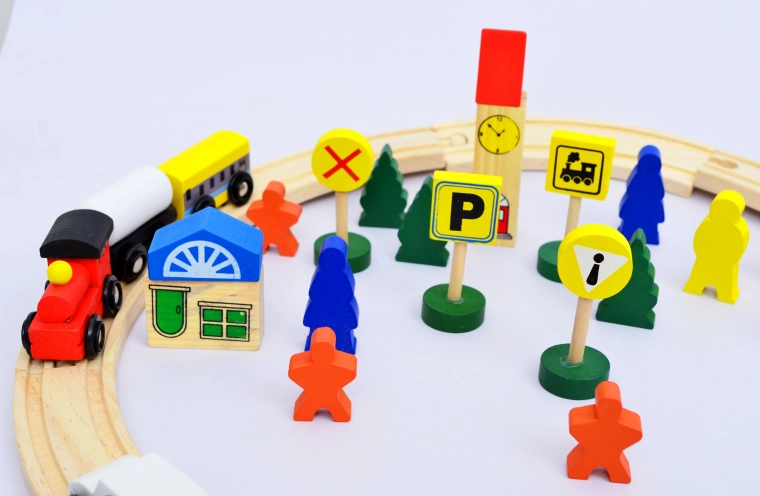 - Dřevěné koleje, vláček s vagónky na magnet, figurky, auto, budova, dopravní značky