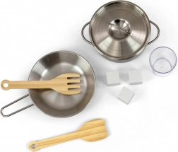 Pánev, hrnec s poklicí, dřevěná obracečka a vidlička, kelímek, 3 kostky ledu
