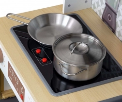 Součást balení: kovová pánev, hrnec s poklicí, dřevěná obracečka a vidlička, průhledný kelímek a 3 kostky ledu. Kuchyňka roste s dítětem díky nastavitelným prodlužovacím dílům nožek, takže vydrží dlouhé roky radostného hraní.