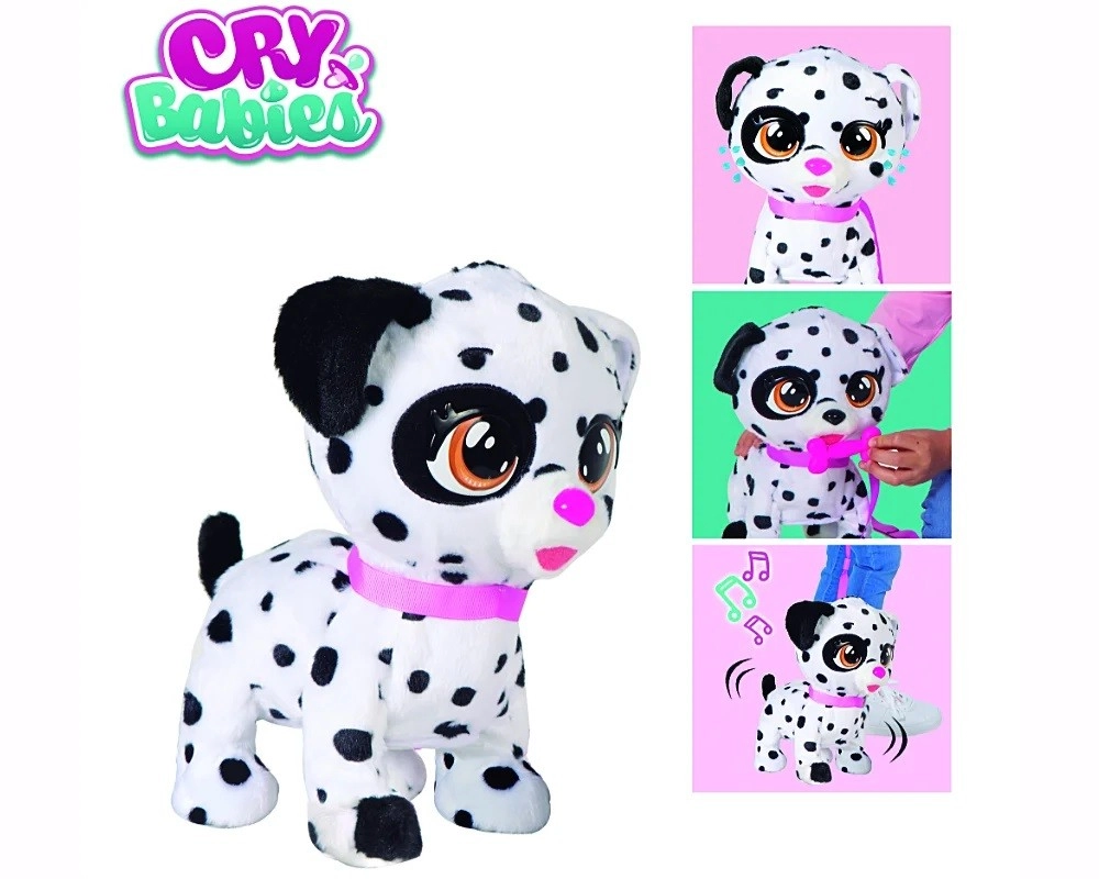 Roztomilý interaktivní pejsek dalmatin Spot z řady CRY BABIES je skvělý kamarád pro malé děti. Vydává až 20 různých zvuků, reaguje na dotek, umí plakat opravdové slzy a díky přiložené smyčce a kosti ho děti mohou „venčit“, krmit a uklidňovat. Podporuje empatii, zodpovědnost a rozvoj sociálních dovedností.