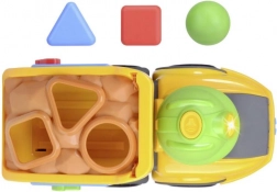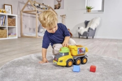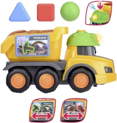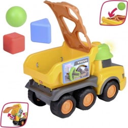Žluté Volvo nákladní autíčko s veselým designem a barevnými kostkami na tvarový sorter je ideální pro rozvoj motorických dovedností.