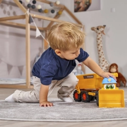Objevte svět plný zábavy a fantazie s naším oficiálně licencovaným dětským nákladním automobilem Volvo. Tento model kombinuje funkcionalitu sklápěčky a bagru a nabízí pohyblivou a odpojitelnou přívěs. Hračka podporuje rozvoj motorických dovedností a koordinaci rukou. Tlačítkem na modré přilbě aktivujete realistické zvukové efekty, které dodají hře autentičnost.
