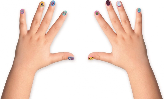 Set obsahuje návody, umělé nehty i samolepky – vše, co děti potřebují k kreativnímu zdobení doma i na cestách.