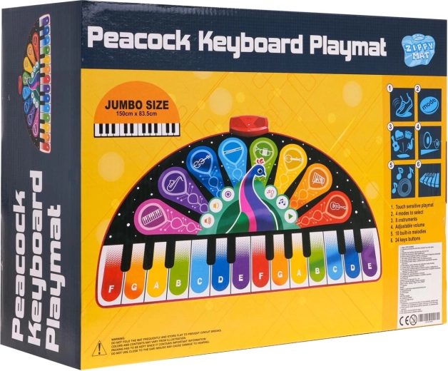 Muzikální hrací podložka Páv od Zippy Mat je skvělou zábavou pro děti od 3 let, která kombinuje pohyb a rozvoj hudebních dovedností. Tato pestrobarevná podložka s 24 klávesami a osmi různými hudebními nástroji, jako jsou piano, vibrafon nebo kytara, poskytuje dětem hodiny interaktivní hudební zábavy.