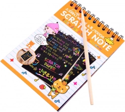 Kreativní duhový notes A6 s černými stránkami, pod nimiž se skrývá pestré duhové pozadí. Pomocí dřevěného rýsovacího nástroje děti snadno vytvářejí obrázky, vzory i zprávy. Ideální na cesty, do školy i domů pro rozvoj fantazie a jemné motoriky.