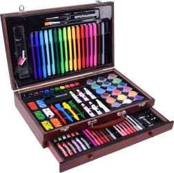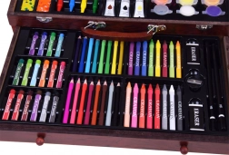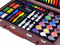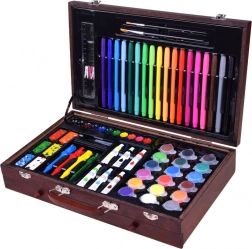 Dřevěný kufřík s rozměry 37 cm x 23 cm x 7,5 cm zajišťuje snadné přenášení a ukládání všech výtvarných potřeb.