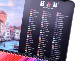 Pastelky jsou uspořádány v kovovém pouzdře s uměleckým motivem a názvem barev v angličtině, ideální pro přenosnost a skladování.