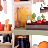 Interaktivní digestoř s LED a melodiemi, vajíčkovar se světlem a zvukem i křídová tabulka na psaní menu rozvíjejí fantazii i jemnou motoriku. Kuchyňka nabízí dostatek úložného prostoru – police, šuplíky, háčky – a bohatou sadu nádobí, potravin a kořenek pro nekonečné scénářové hry.