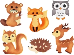 Vytvořte si veverku (15 × 14 cm), ježka (10 × 15 cm), sviště (15,5 × 13,5 cm), lišku (15 × 12 cm), sovu (13 × 11 cm) a jelínka (16,5 × 12 cm).