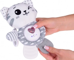 Roztomilý plyšový kocourek pro nejmenší kombinuje hned tři funkce: interaktivní melodie, jemné chrastění a šustění a měkké kousátko pro úlevu při prořezávání zoubků. Příjemný šedo-bílý design, měkoučký materiál a praktické závěsné poutko z něj dělají ideálního parťáka do postýlky, kočárku i autosedačky.