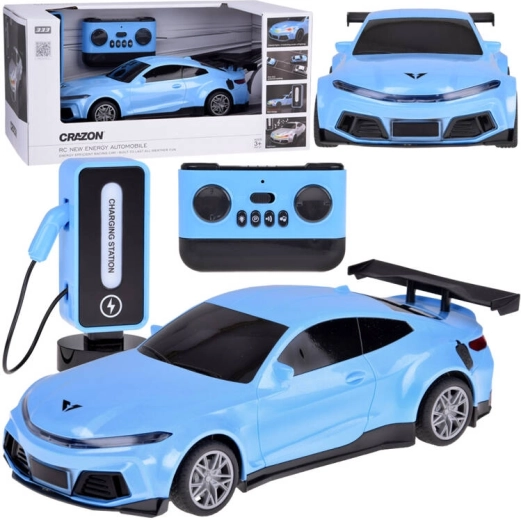 Modré RC závodní auto s realistickými detaily a nabíjecí stanicí jako u skutečných elektromobilů potěší každého malého milovníka rychlosti. Nabízí jízdou vpřed/vzad, zatáčení vpravo/vlevo, automatické parkování, světelné efekty v 5 režimech a zvuk klaksonu a hudby. V balení je dobíjecí baterie pro auto i stanici a ovladač s intuitivním ovládáním.