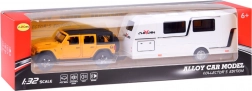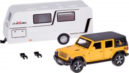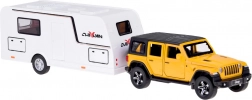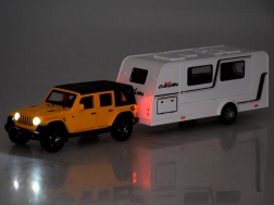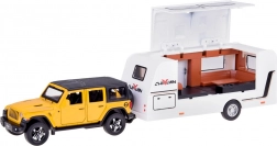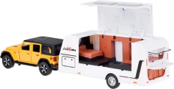 Tato detailně zpracovaná sada kombinuje robustní terénní auto a funkční karavan, takže děti mohou vytvářet vlastní prázdninové příběhy. SUV je z kovu s plastovými doplňky, má funkční dveře, otevíratelný kufr, světelné efekty a zvuk motoru. Díky pull-back mechanismu se vůz po natažení sám rozjede.