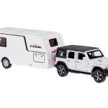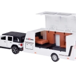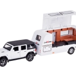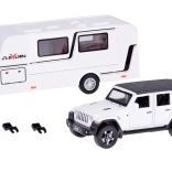 Objevte zábavu na cestách s realistickým terénním autem v měřítku 1:32 a karavanem. Model má kovové prvky, otevírací dveře i kufr a efekty světla a zvuk. Díky natahovacímu pohonu pull-back se snadno rozjede a otevírací karavan s vybavením podpoří kreativní hru.