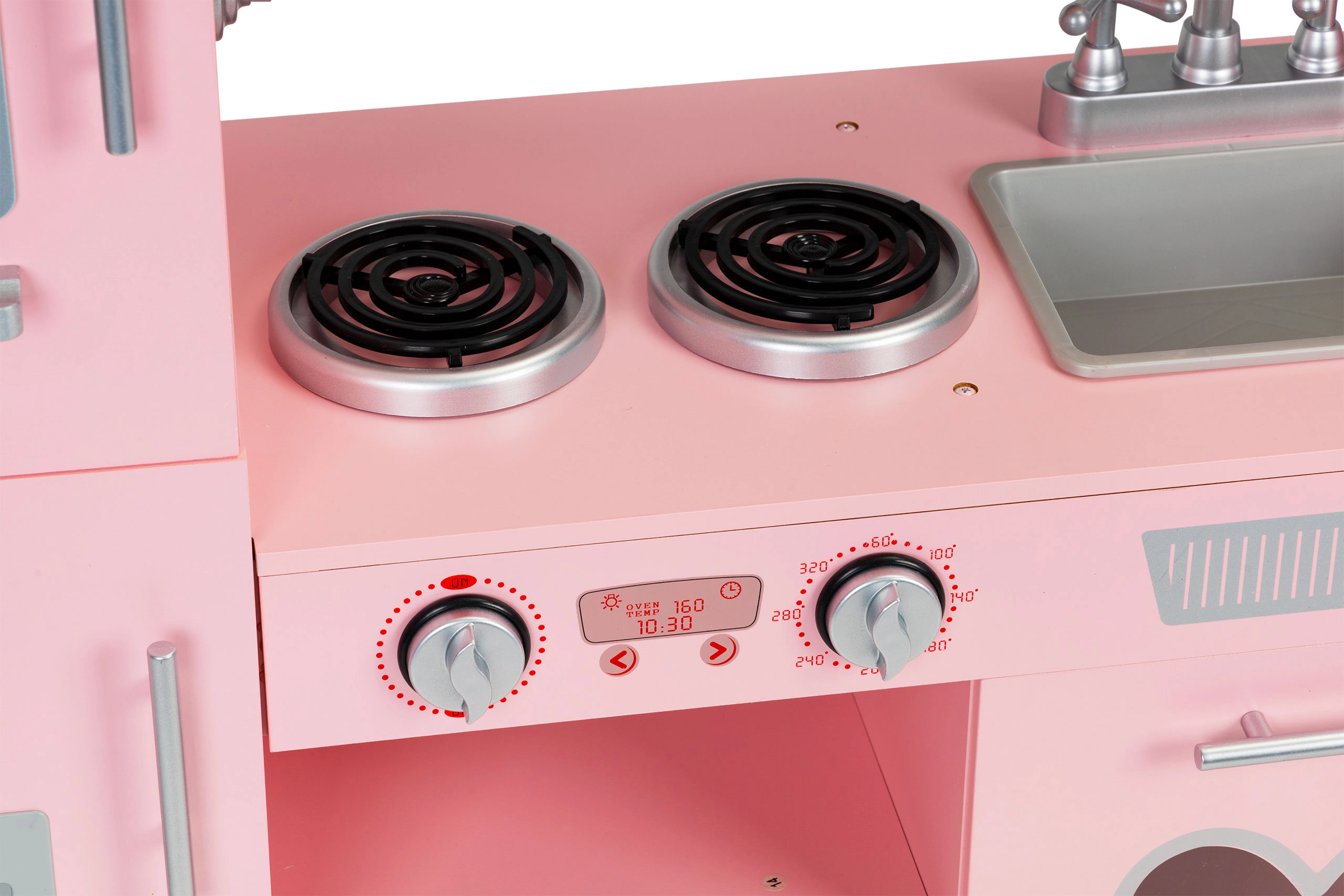 Dětská kuchyňka je vybavena zvukovými efekty, otočnými knoflíky a výdejníkem na vodu, což přináší realistický zážitek z vaření.
