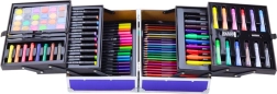 V sadě najdete bohatý výběr pomůcek: akrylové markery, oboustranné fixy s tenkou i širokou špičkou pro precizní detaily i velké plochy, pastelky, olejové a suché pastely, vodové barvy, dva štětce, gumu, ořezávátko a sešit s omalovánkami. Vše je přehledně uloženo a připraveno k použití.