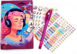 Stylový dětský diář s motivem Magic Light Music potěší každou kreativní duši. Obsahuje 40 linkovaných listů, tvrdé desky s LED světýlky, zamykání na klíček, 2 archy samolepek a dvojitý propisovací fix – jedna strana píše klasickým inkoustem, druhá neviditelným inkoustem viditelným pod speciální UV „lampičkou“ v peru.