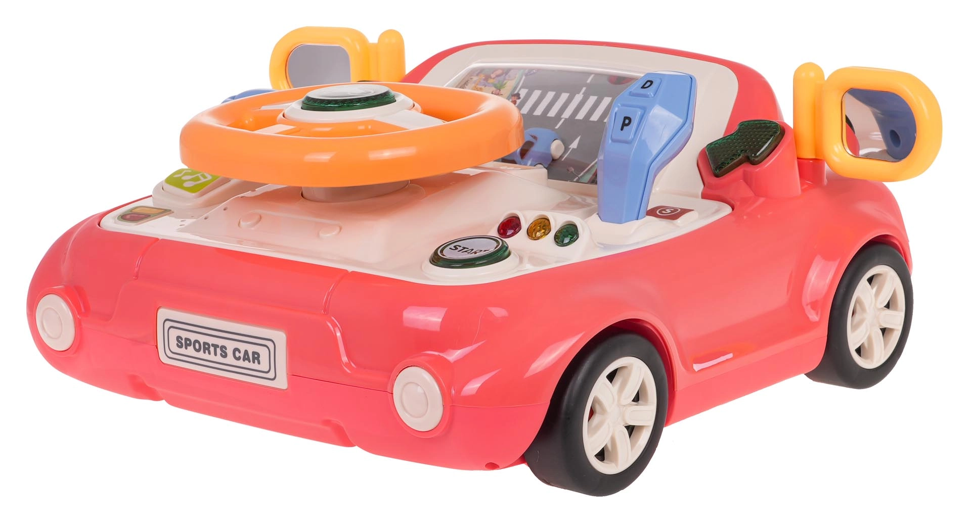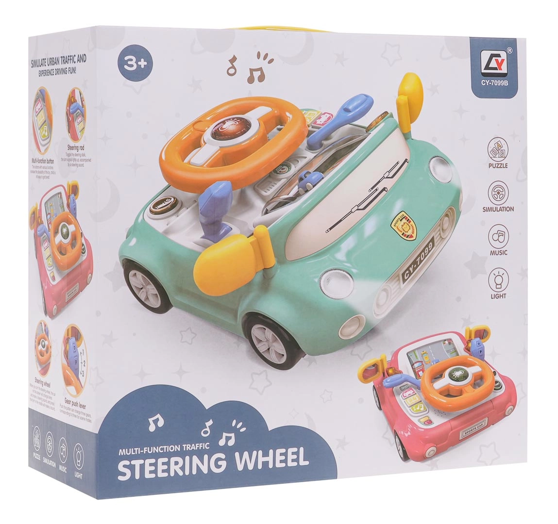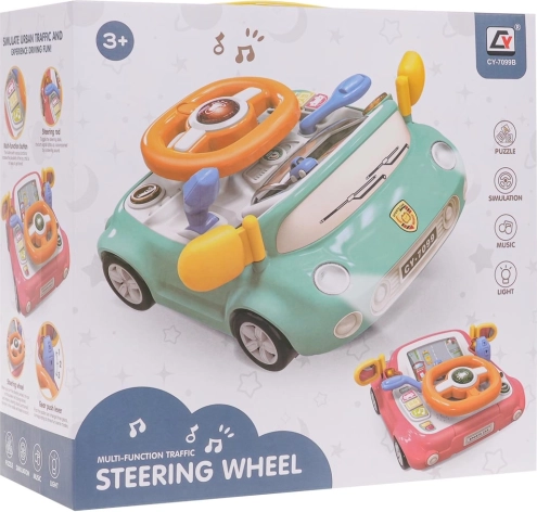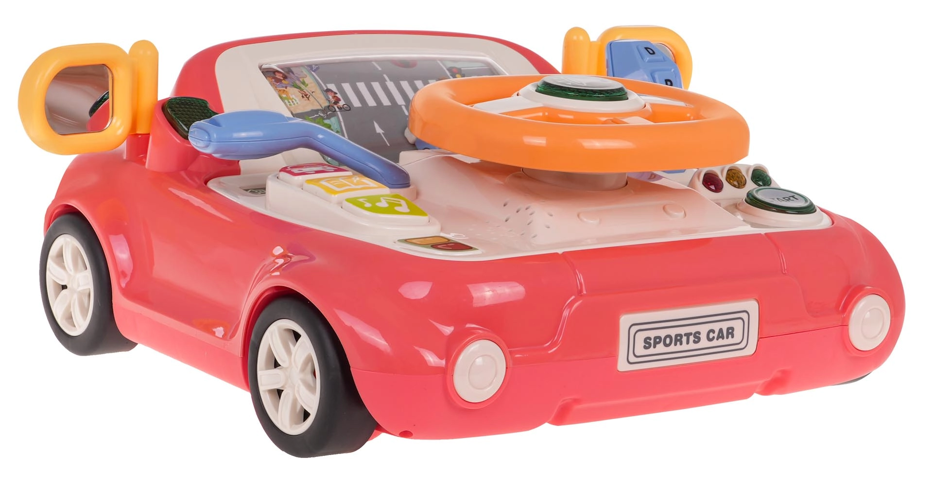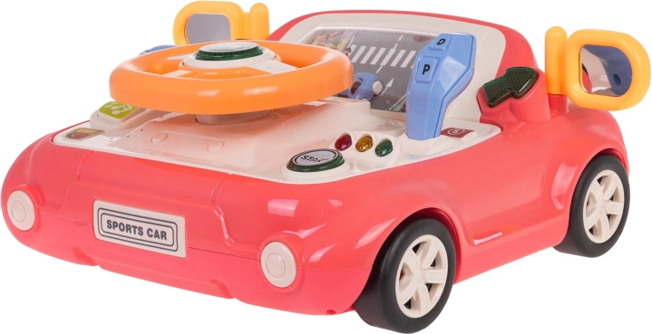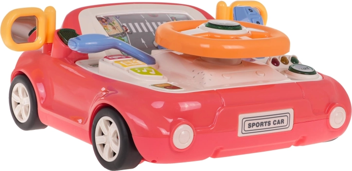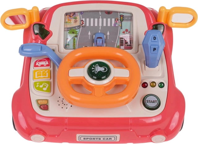 Zábavná interaktivní hračka ve tvaru autíčka pro děti od 3 let. Nabízí světelné a zvukové efekty, otáčecí volant s podsvíceným klaksonem, řadicí páku, směrovky a obrazovku s pohybující se silnicí a autíčkem. Pevné provedení z kvalitního plastu, bez ostrých hran, se čtyřmi přísavkami pro stabilitu a výuku dopravních pravidel formou hry.