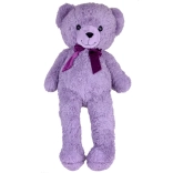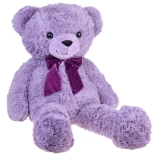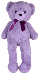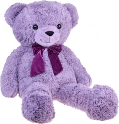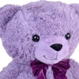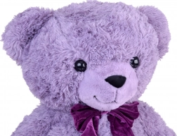 Výrazné černé oči a sametová fialová mašle dodávají medvídkovi osobitý šarm.
