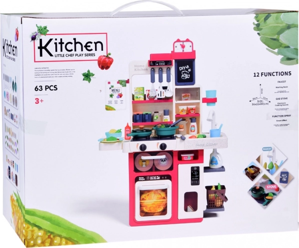 Tato interaktivní kuchyňka je ideální volbou pro malé kuchaře od 3 let. Dva podsvícené hořáky po otočení září červeně, vydávají autentické zvuky vaření a po přidání vody vytvoří skutečnou páru. Funkční kohoutek s pumpičkou zajistí oběh vody a naučí děti základům kuchyňské hygieny a péče o nádobí.