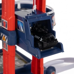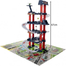Interaktivní výtah lze upevnit zleva i zprava, ovládá se barevnými tlačítky (nahoru/dolů), doprovází jej blikající světla a zvukové efekty (sirény, klakson, pracovní stroje), které umocní dětskou představivost. Součástí je velká hrací podložka s mapou města, na kterou postavíte garáže a rozmístíte značky, plus 2 autíčka a helikoptéra.