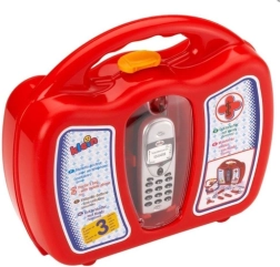Tento lékařský set obsahuje vše potřebné pro hraní na doktora: červený plastový stetoskop, hračkový mobilní telefon (vyžaduje baterie, které nejsou součástí balení), stříkačka, teploměr, nůžky, otoskop, kladívko, náplast, identifikátor, sestra čelenka, krabička na vatové tampony, recept a karta lékařských měření. Červený kufřík je vyroben z odolného plastu s pohodlným uchem a žlutým klipem pro bezpečné zavření. Hračka podporuje kreativní hru a pomáhá dětem zvykat si na návštěvy lékaře.