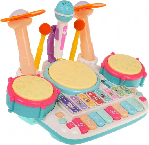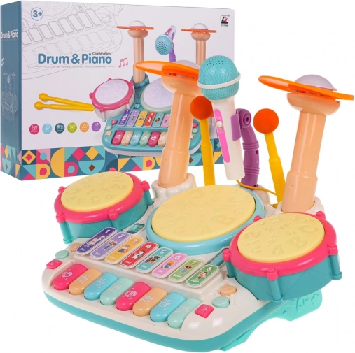 Tento barevný hudební set spojuje bicí a pianino do jednoho zábavného celku. Díky kvalitnímu plastu bez ostrých hran je bezpečný a odolný, zatímco živé barvy lákají ke hře. Podsvícené bubny a činely reagují na každý úder paličkami, což děti motivuje k objevování rytmů.