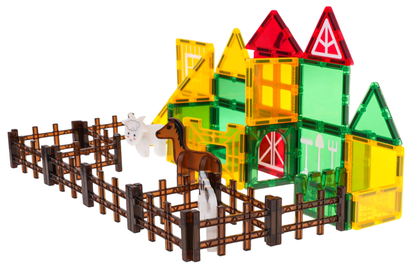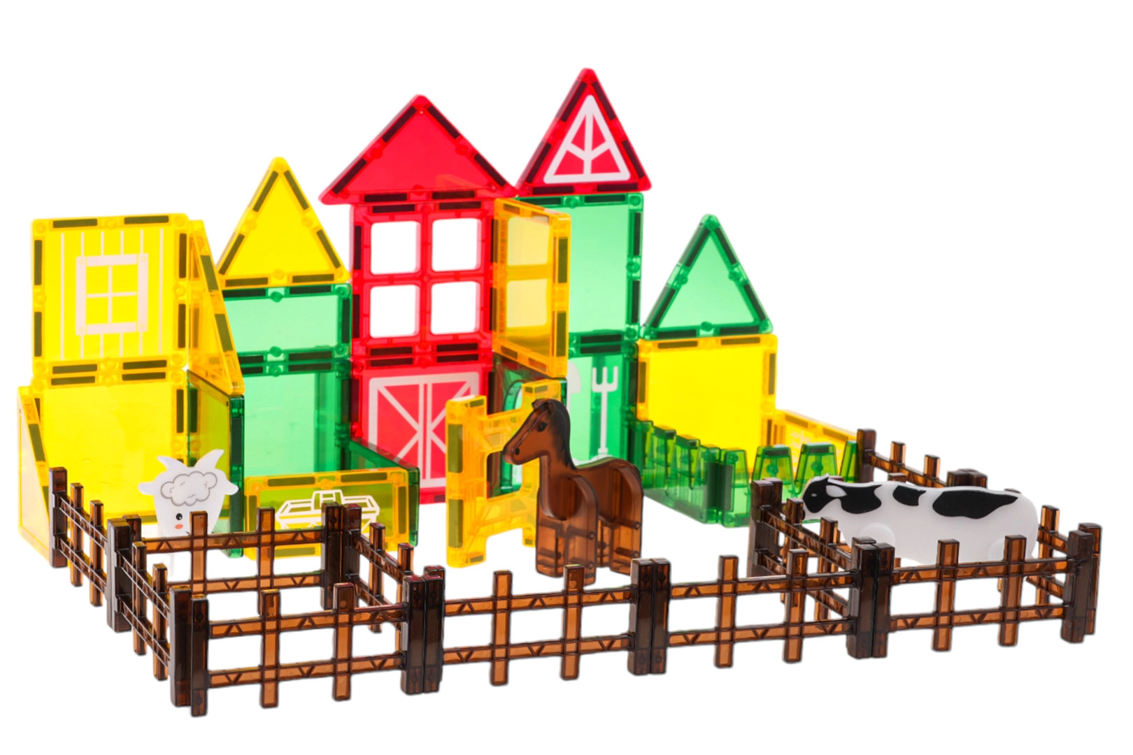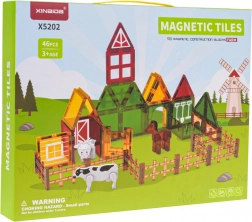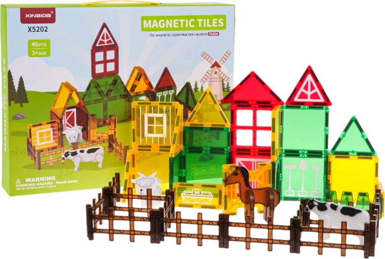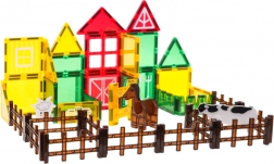 Stavebnice obsahuje 42 magnetických dílků v různých tvarech a barvách, které se bezpečně a stabilně propojují. Děti mohou postupovat podle obrázkového návodu, nebo vytvářet vlastní originální stavby – od ohrady až po celé farmářské hospodářství. Průhledné panely v sytých barvách jsou vizuálně atraktivní a podporují učení hrou.