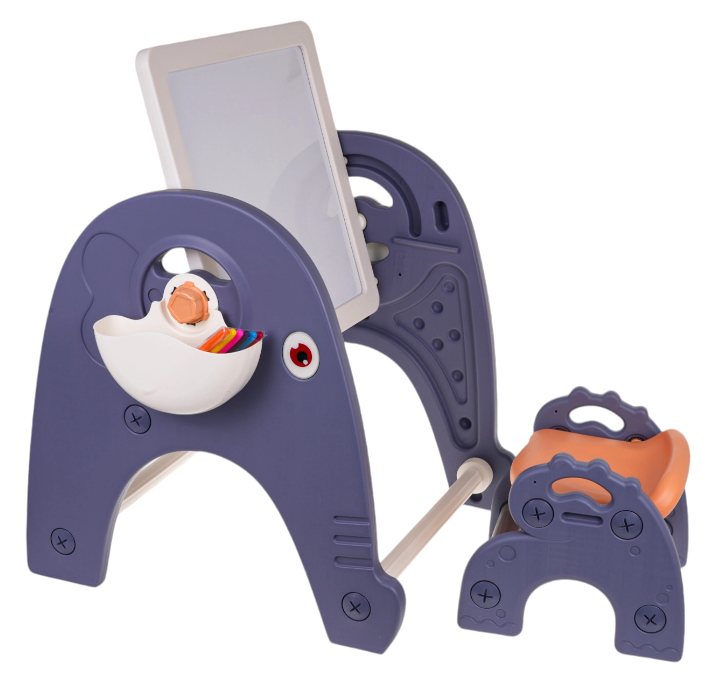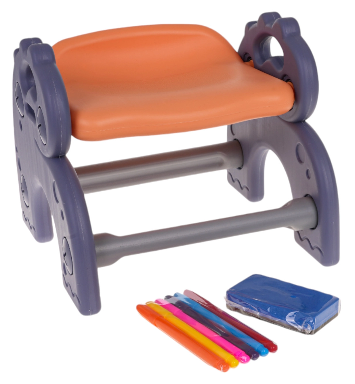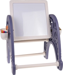 Konstrukce je vyrobena z odolného, bezpečného plastu bez ostrých hran a doplňuje ji stabilní židlička. Po stranách jsou dva košíky pro snadné uložení fixů a drobností. Součástí balení je houbička, 6 barevných fixů a dekorativní nálepky – vše, co děti potřebují ke kreativní zábavě.