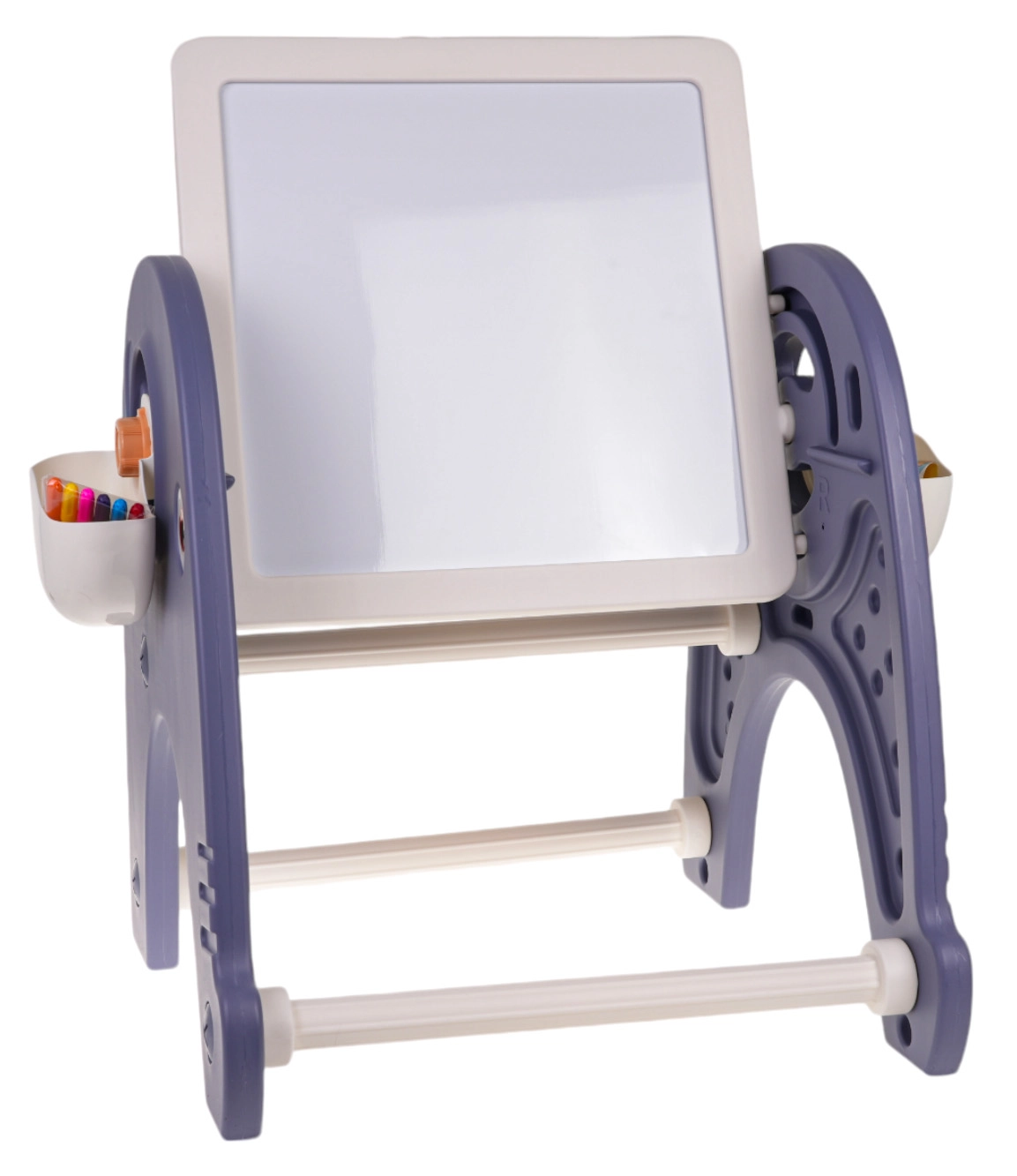 Oboustranná deska nabízí bílou tabuli na kreslení a texturovanou plochu pro kostičky. V horizontální poloze slouží jako praktický stolek.
